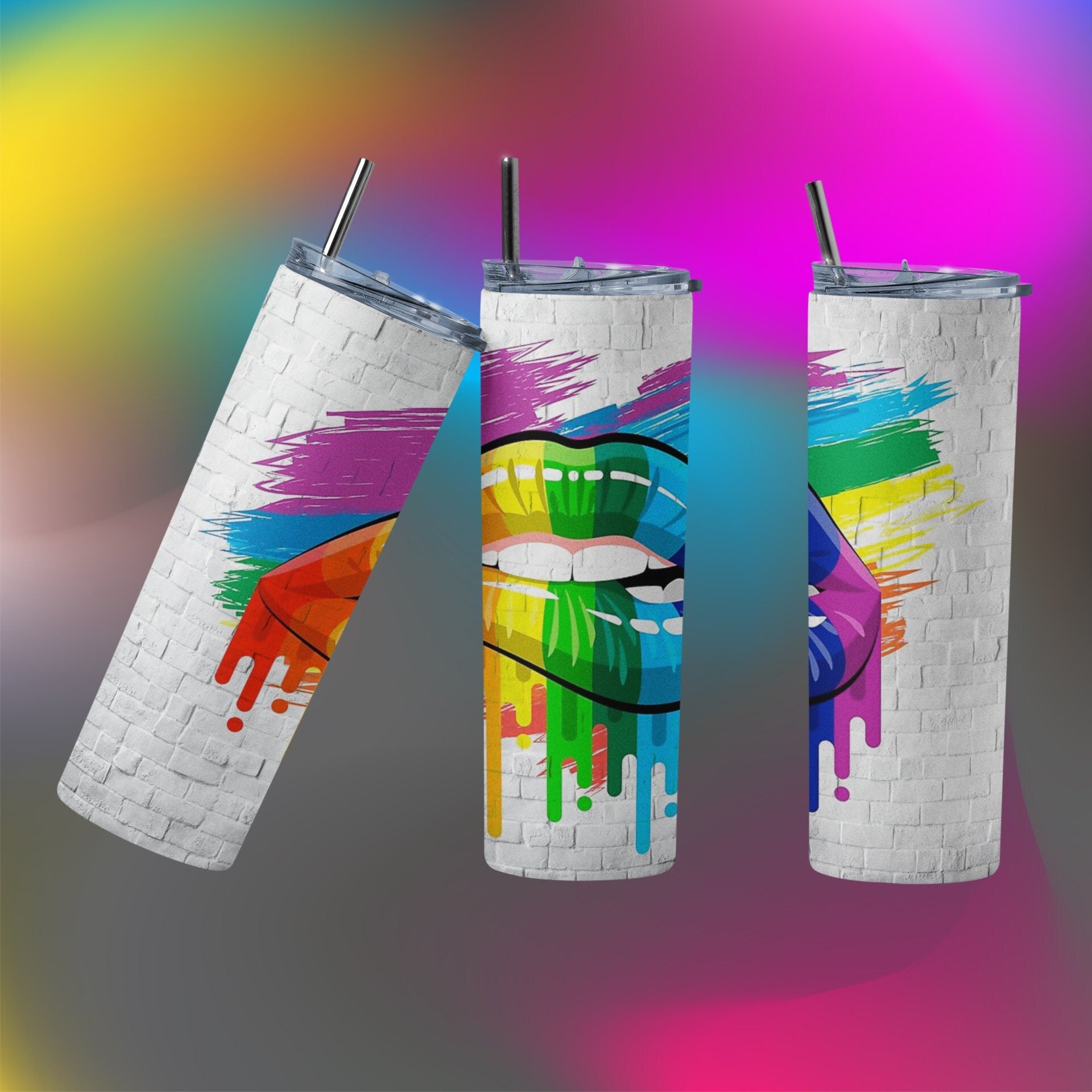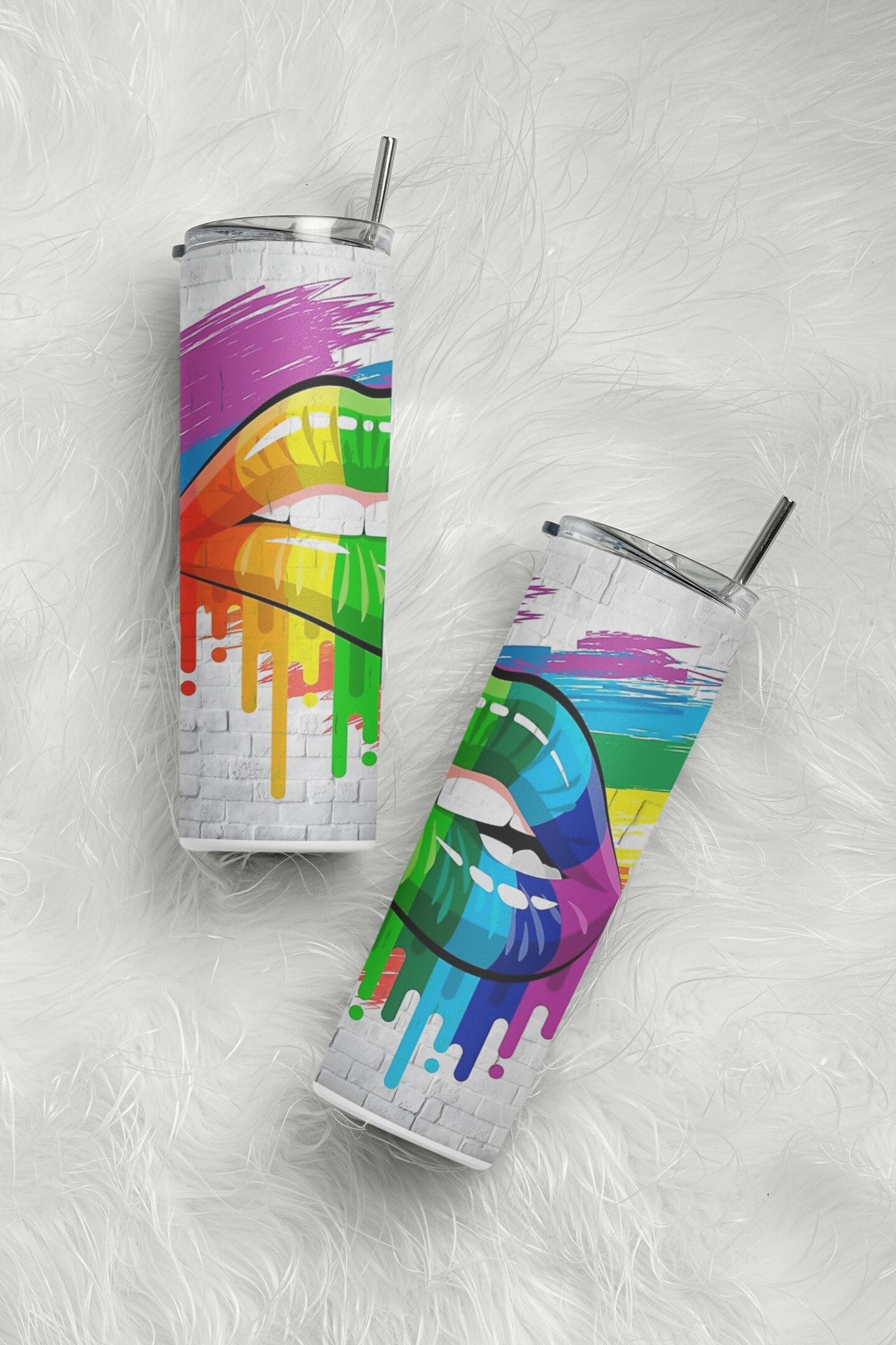 Pride, Rainbow Glossy Lips Sublimation 20 oz Tumbler For 4th of July with lid and straw. Insulated tumbler keeps drinks hot for 6 hours and cold for 12 hours. These make great gifts for your friends in the LGBTQ community.